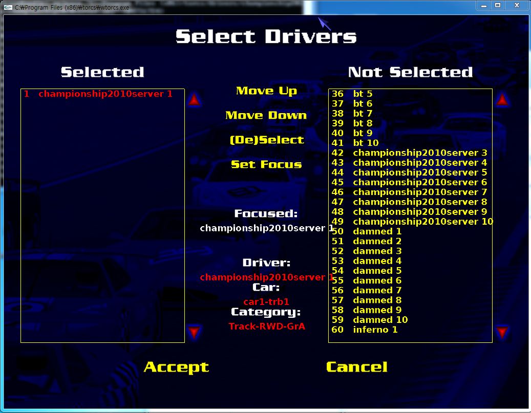 • Run TORCS. RACE-Quick Race-Configure Race- Choose Your Map and you can see the following screen. Please select championship2011server1